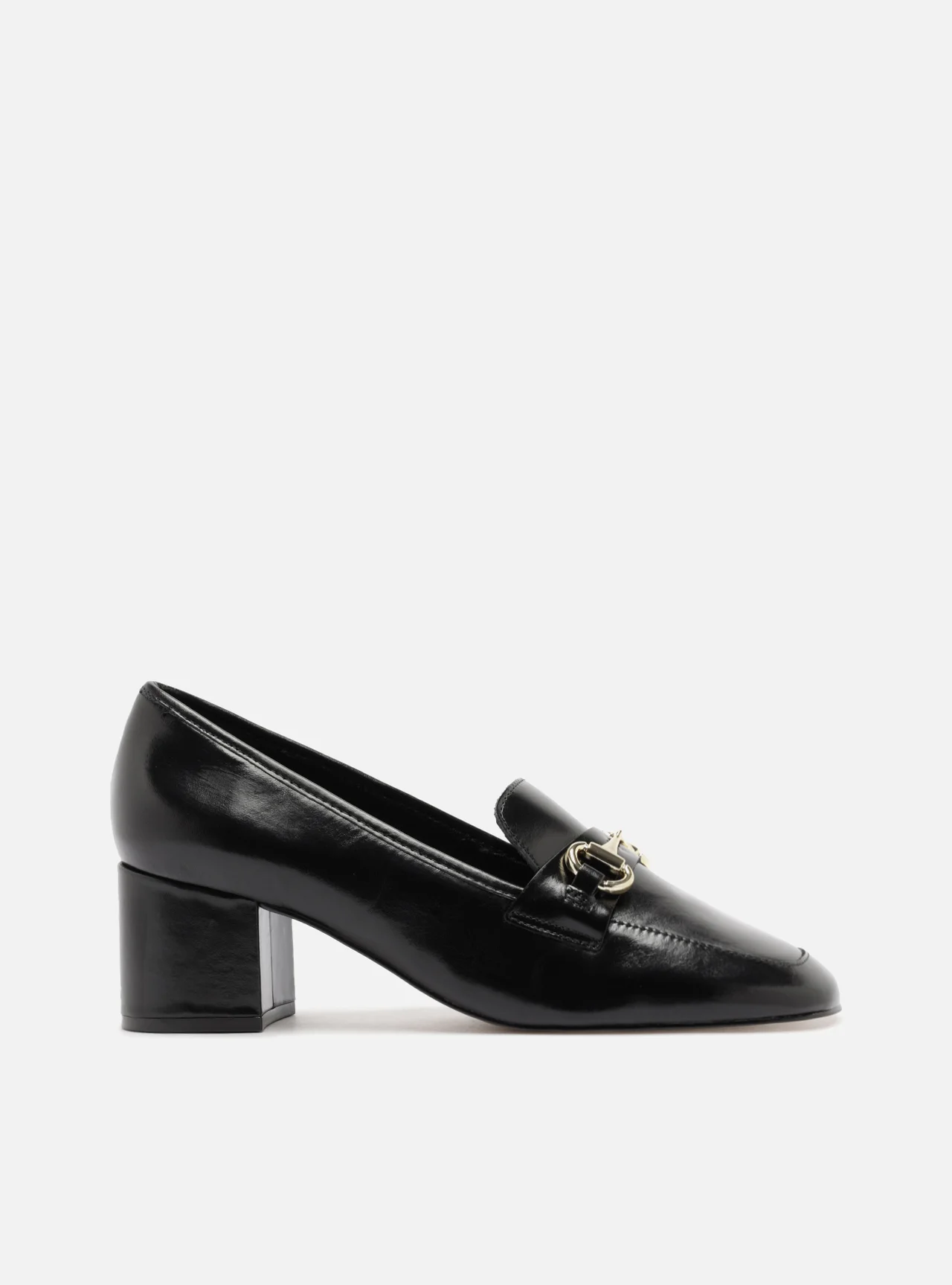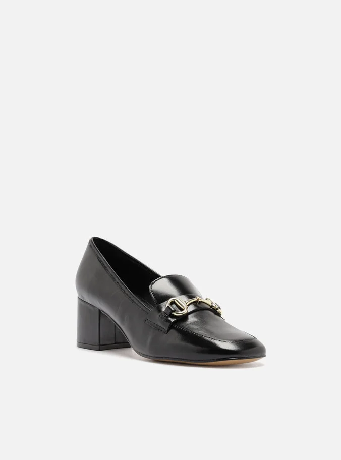 Loafer feminino preto de couro. O sapato tem salto médio bloco e formato arredondado na ponta. Fechado, traz recorte lateral na gáspea e tem aplicação de tira com bridão metálico sobre o cabedal. Exibe toda a parte superior do pé.