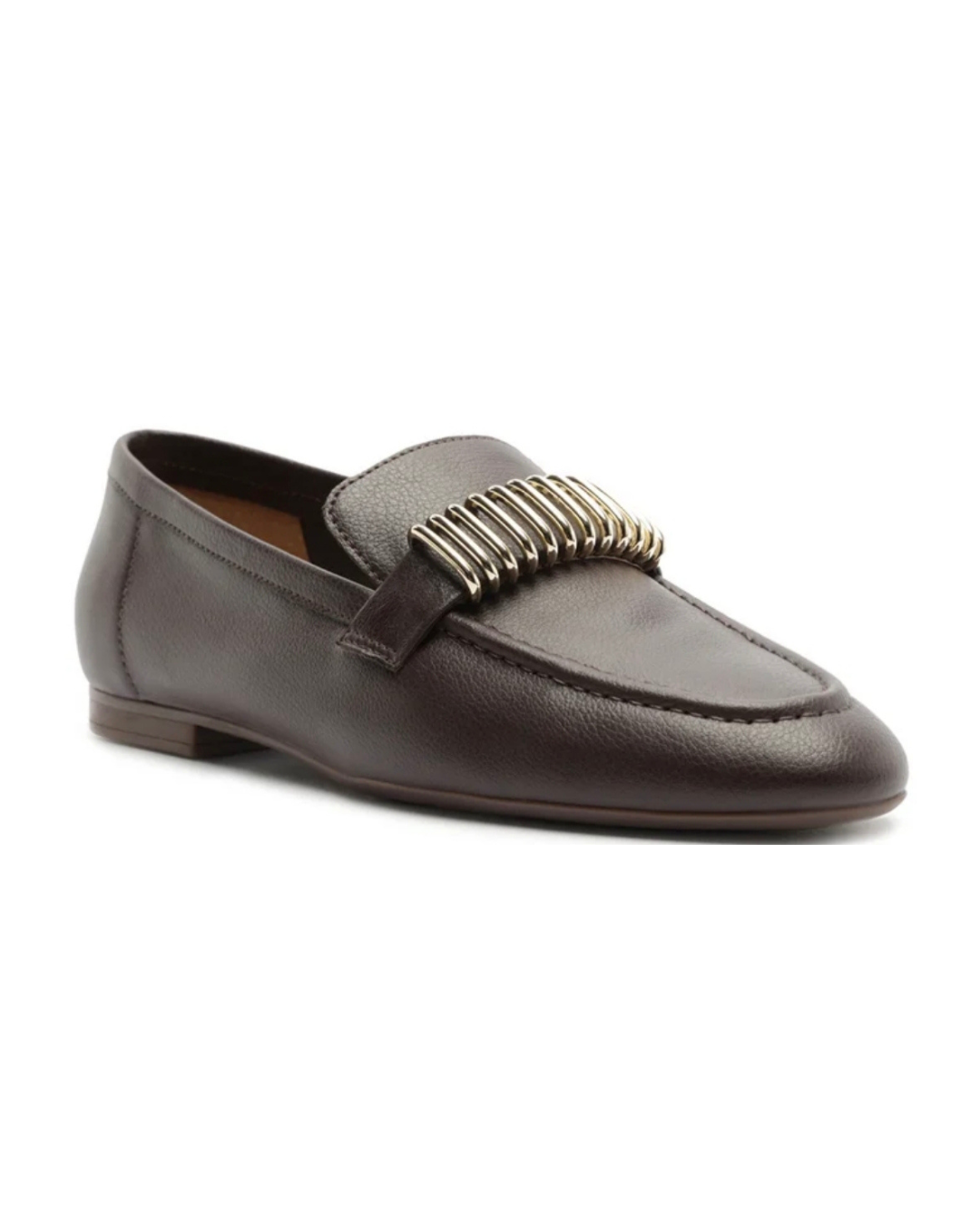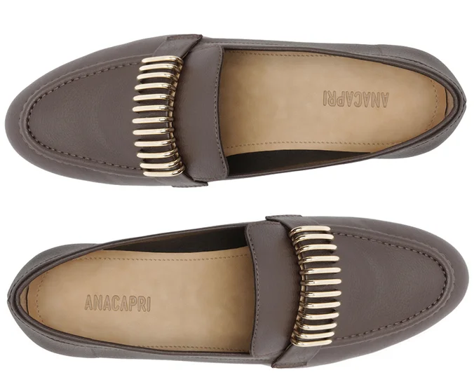 Mocassim com aplicação de metal, na cor marrom. O modelo de material similar ao couro possui bico arredondado e solado emborrachado, com leve saltinho traseiro. Fechado, traz gáspea ampla com recorte lateral em design clássico de mocassim. Com detalhe em adorno metálico imponente, centralizado na faixa do cabedal. Apresenta palmilha comfy com assinatura Anacapri. Porque Apostar: Dias geladinhos e pés aquecidos, sim! O mocassim feminino é um clássico que faz parte da vida das descomplicadas! Democrático e atemporal, o calce easy vai do office ao passeio com muito estilo. Imponente e cheio de personalidade, ele fica ainda mais moderninho e cool com esse detalhe metálico poderoso no cabedal.