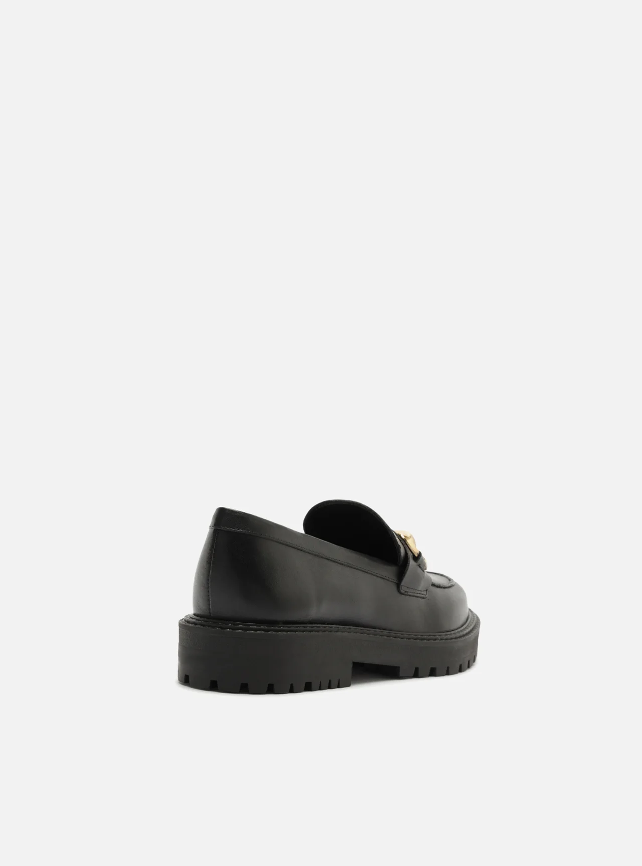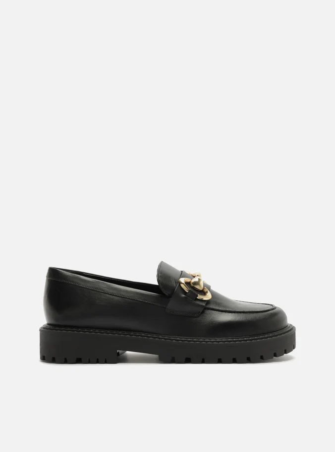 Mocassim feminino preto de couro. O modelo tem salto baixo bloco, solado emborrachado e tratorado preto e bico redondo. Fechado, traz recorte lateral na gáspea, costura destacada na biqueira e aplicação de tira larga e bridão metálico sobre o cabedal. Com palmilha da cor do modelo e gravação do nome da marca.