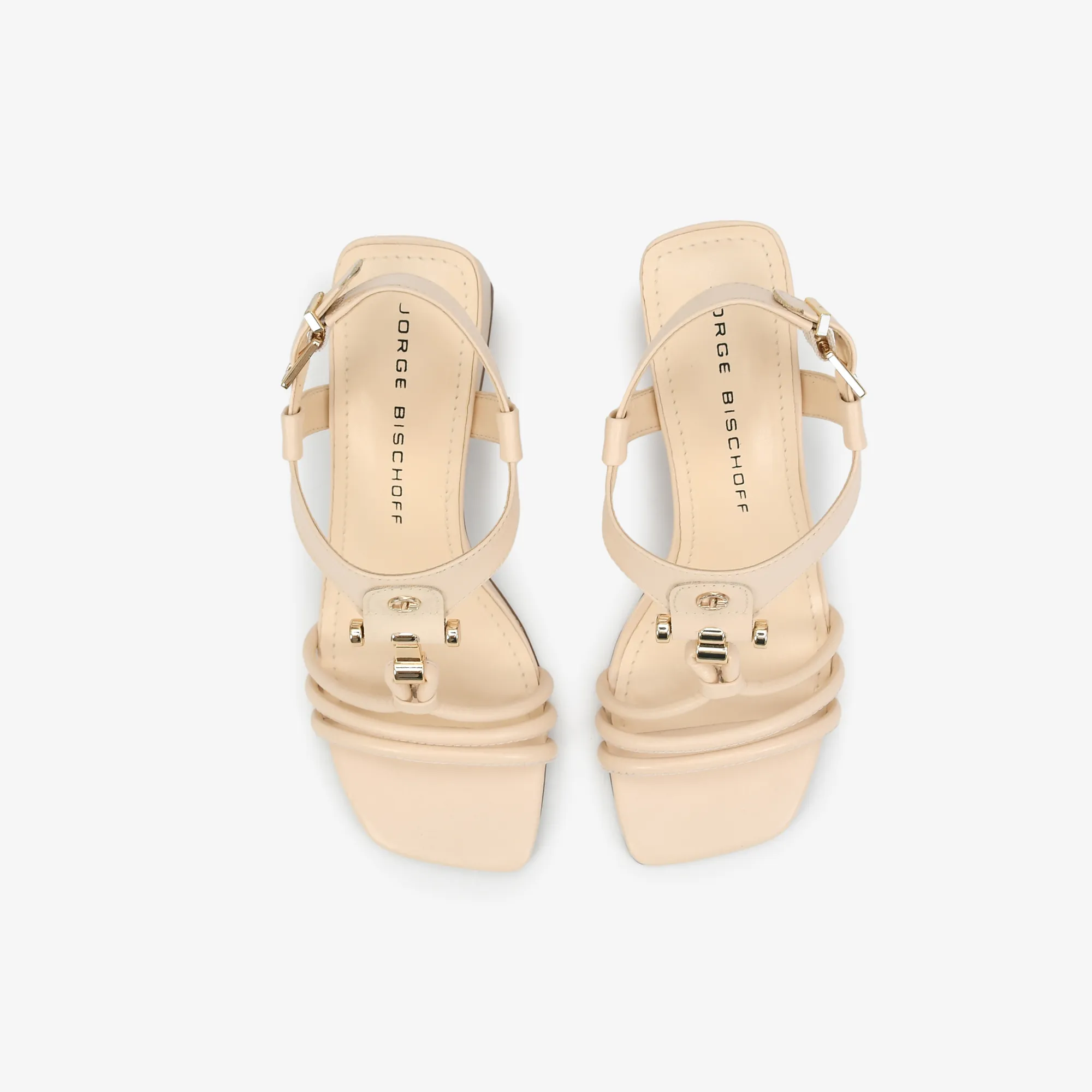 O modelo possui sola marrom, salto bloco médio, com acabamento em couro na cor amarelo butter, bico quadrado, tiras duplas que passam por cima dos dedos, tiras que passam pelo meio do pé, com detalhe em metal na cor dourado, personalizado com as iniciais JB. Fechamento por tira com fivela que passa pelo calcanhar. Na parte externa da sola esse modelo leva a mini mandala JB em metal na cor dourado.