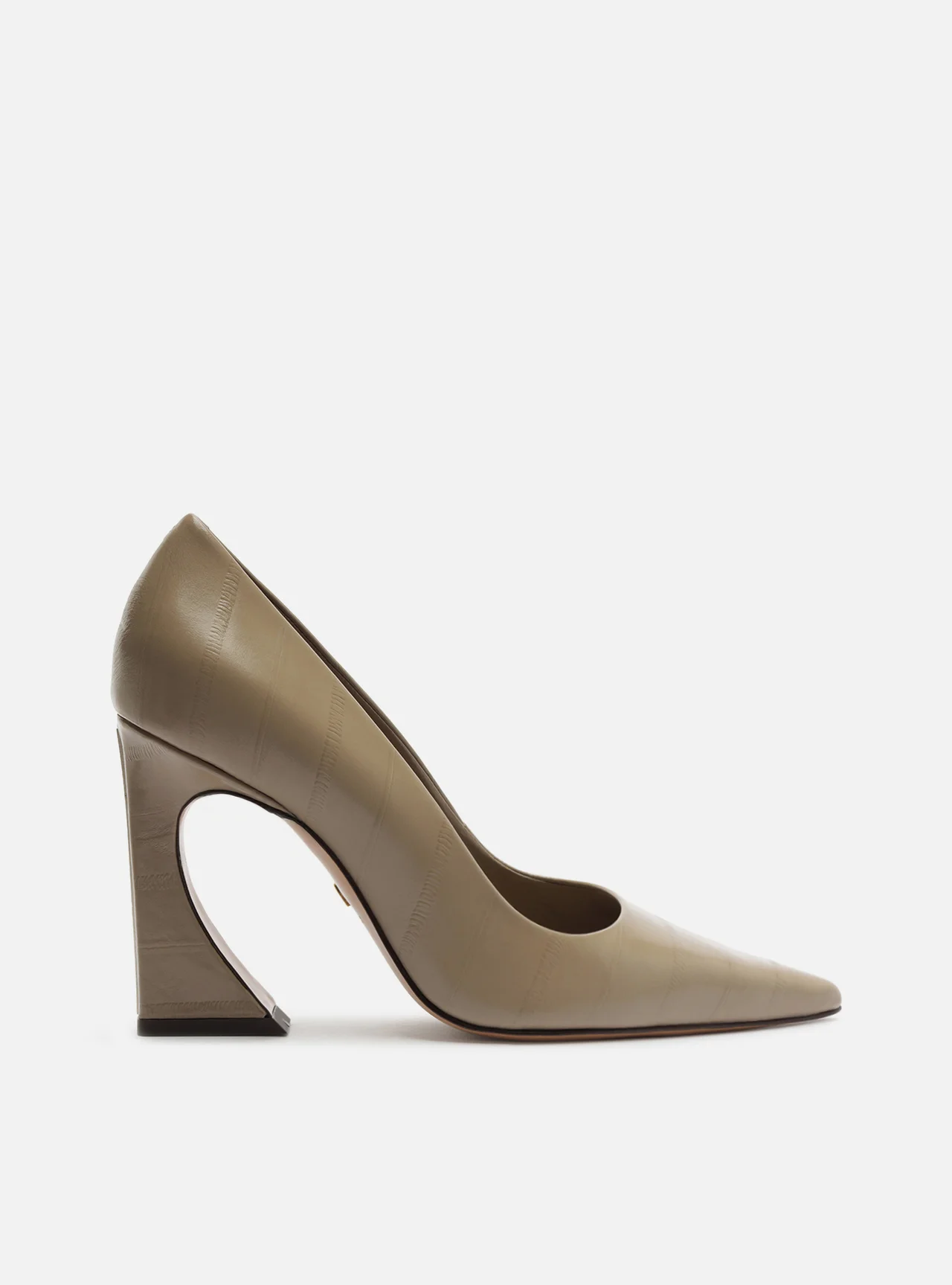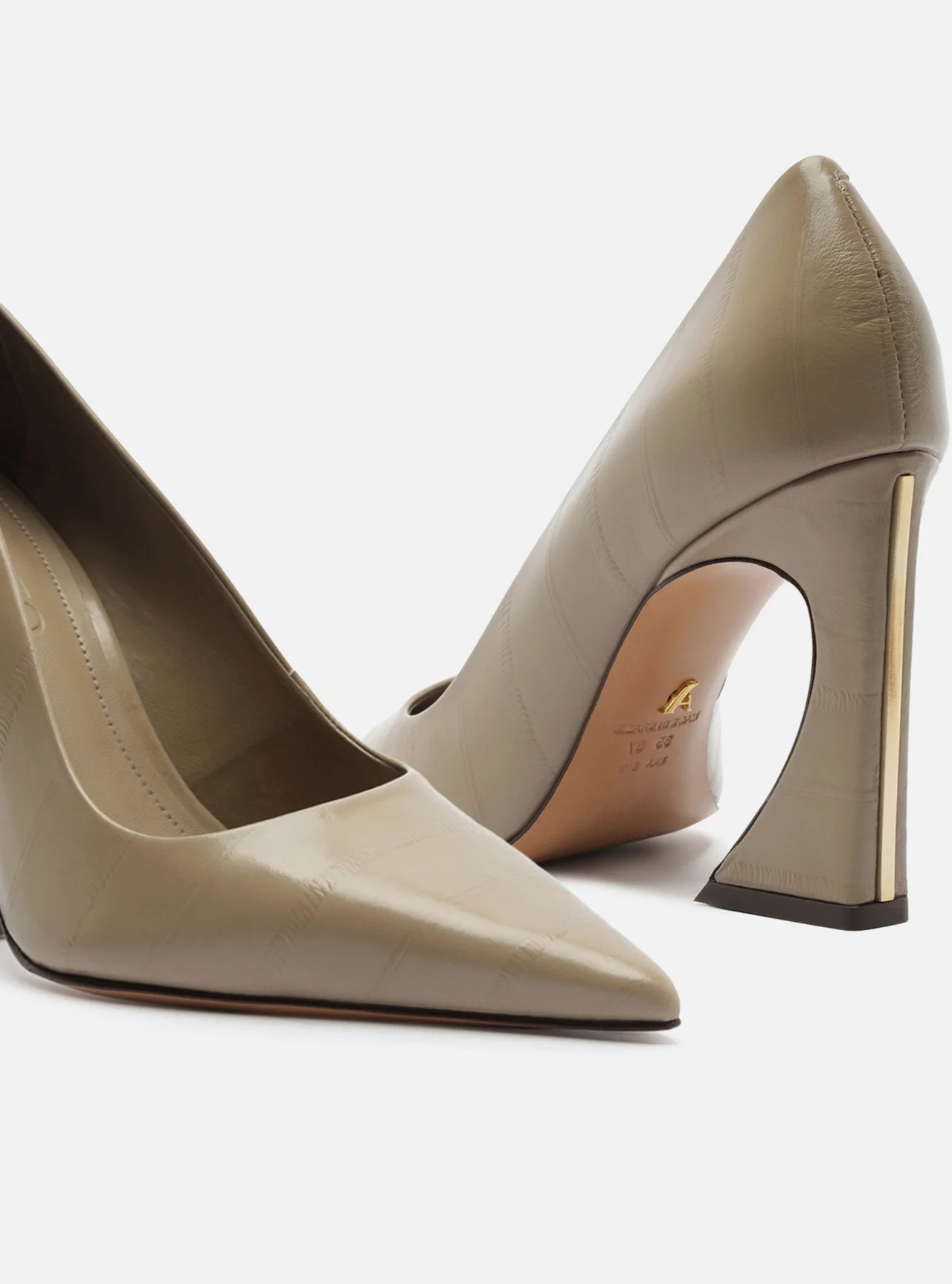 Scarpin feminino cinza de couro. O sapato tem salto alto geométrico flare e formato fino na ponta. Fechado, traz cabedal com recorte arredondado na parte superior do pé e formato ajustado nas laterais. Com palmilha na cor do sapato e inscrição do nome da marca.