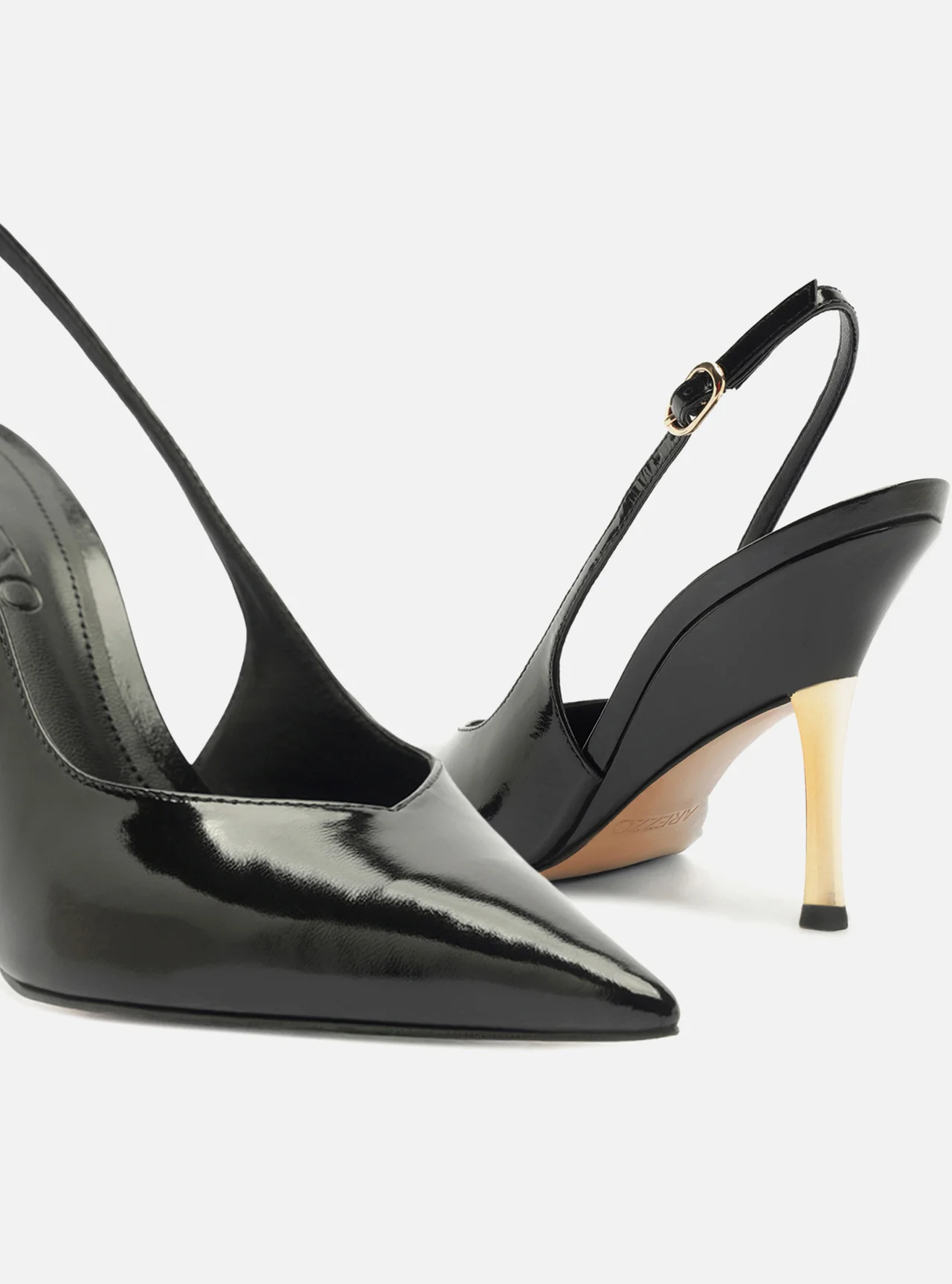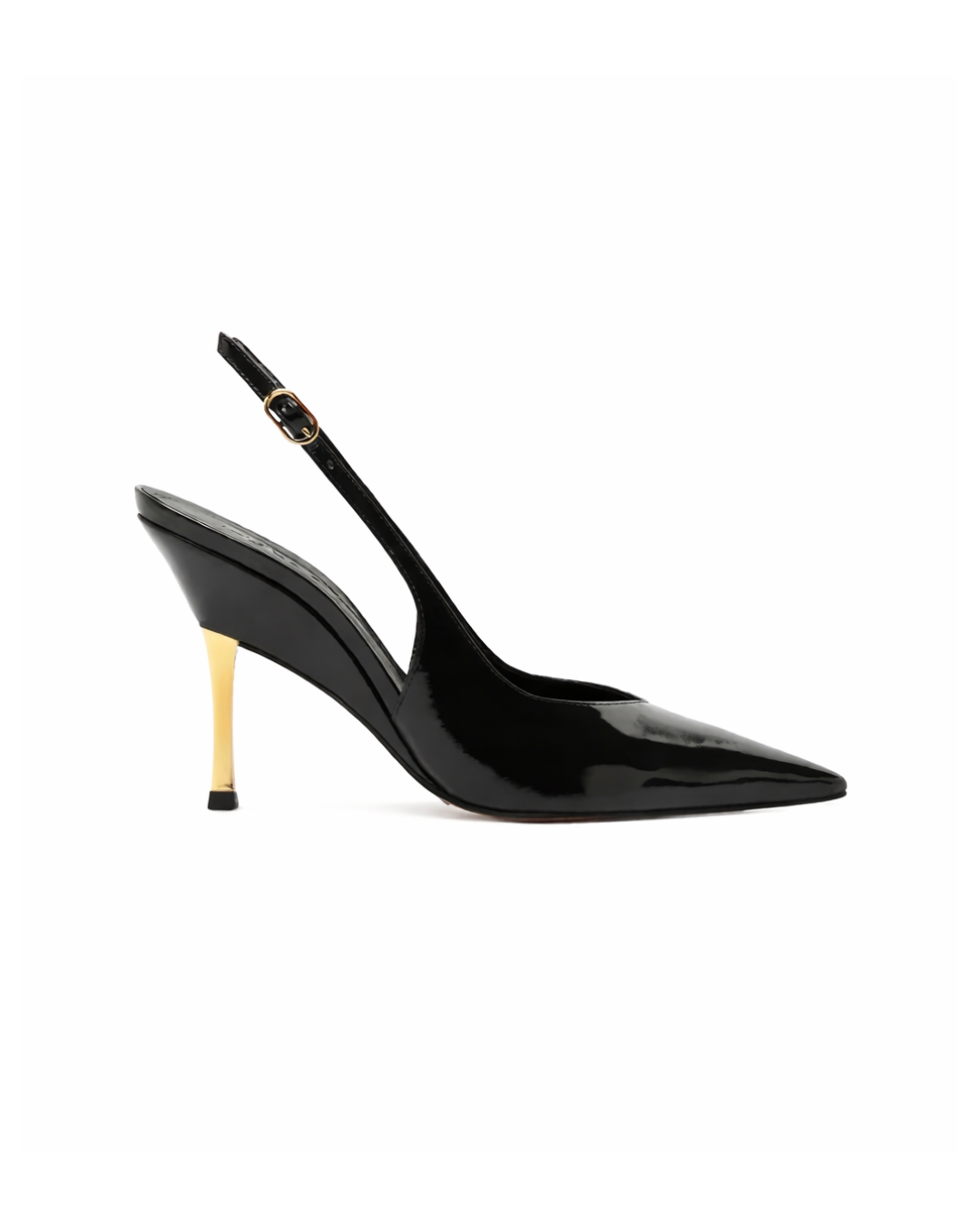Scarpin feminino preto de couro com acabamento envernizado. O sapato tem salto alto fino dourado e formato fino na ponta. Possui tira slingback em torno do calcanhar com fivela lateral ajustável. Fechado na parte frontal, traz recorte em V na parte superior do pé. Com palmilha lisa e inscrição do nome da marca.