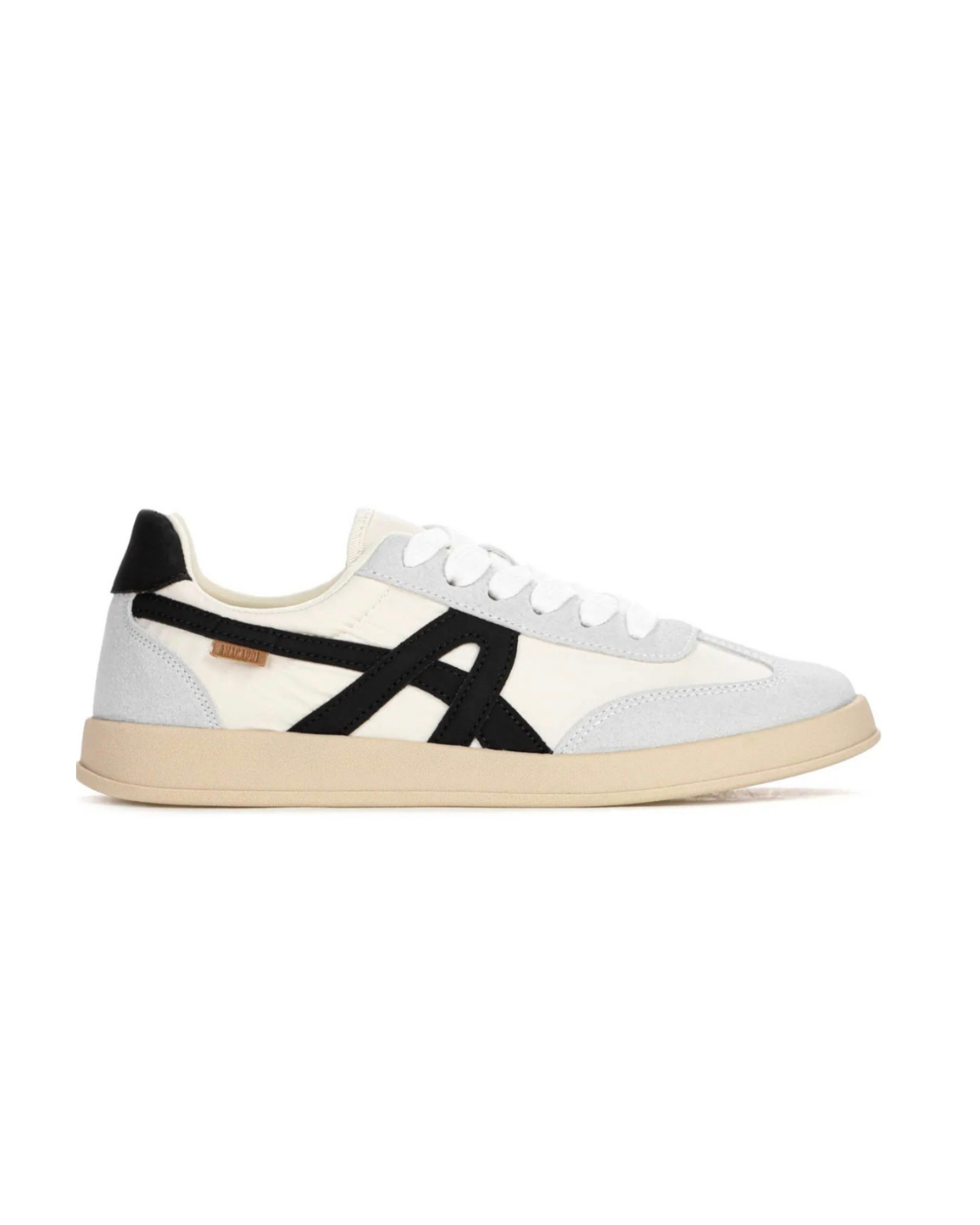 Tênis Anacapri em tecido, nos tons branco e preto. De solado baixo emborrachado bege, o modelo apresenta design de costura pesponto nos contornos, com recortes em peças em camurça cinza aplicadas na biqueira, lingueta e na parte traseira. Traz peça traseira superior em napa azul. De amarrar, com atacadores brancos, possui parte interna forrada, com palmilha comfy e assinatura Anacapri. Com aplicação de peça lateral personalizada em preto, com recortes com design em “A” em napa e tag lateral marrom Anacapri.
