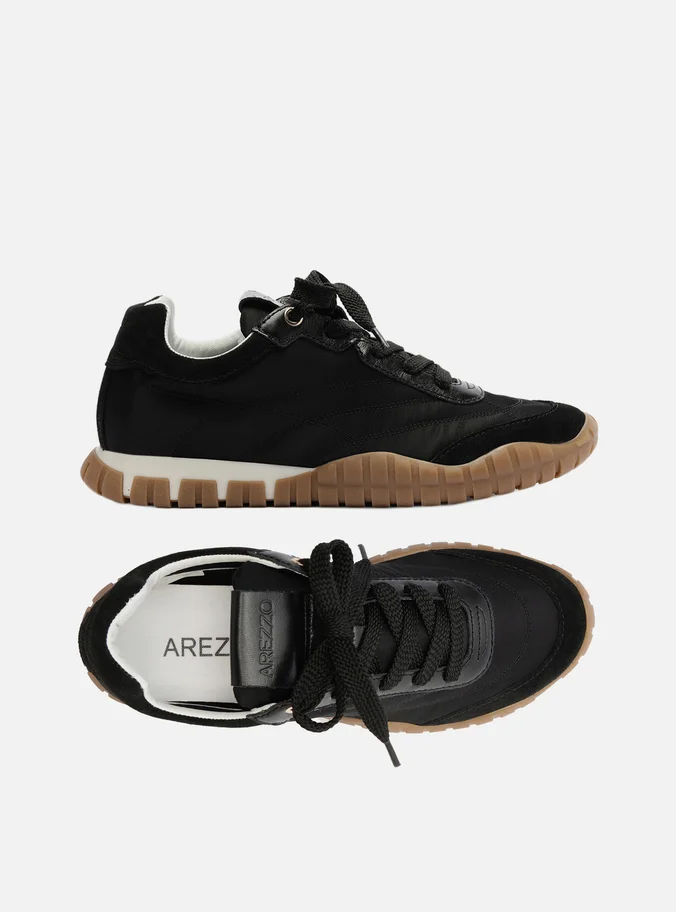 Tênis feminino preto em couro, suede e nylon. O sapato tem sola baixa, esportiva, emborrachada e bege, com relevo riscado e irregular. Traz costuras pesponto por todo o cabedal. Com formato arredondado na ponta, o tênis tem fecho em cadarços pretos e tag do nome da marca na língua.