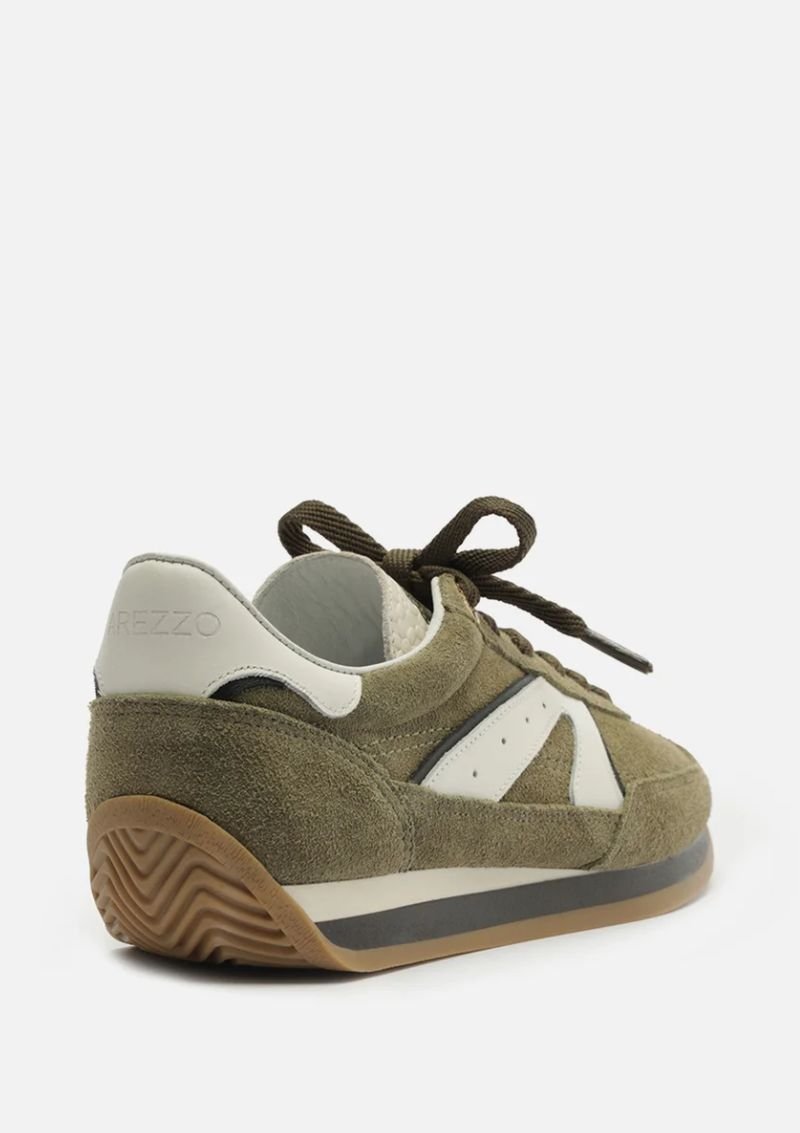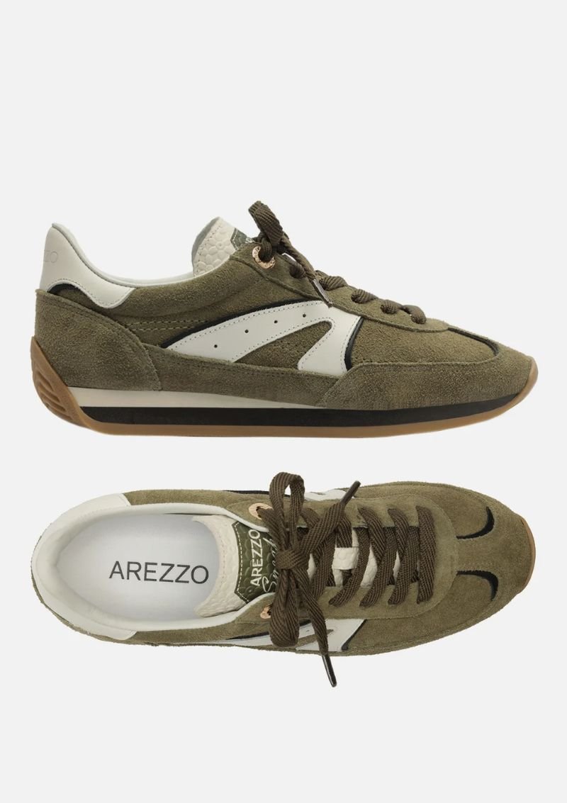 Tênis verde em camurça. O tênis de amarração tem solado baixo emborrachado bege, com entressola branca e preta. Traz cabedal com recortes e aplicações em couro branco nas laterais e calcanhar. Com formato arredondado na ponta, tem fecho em cadarços verdes e língua texturizada.